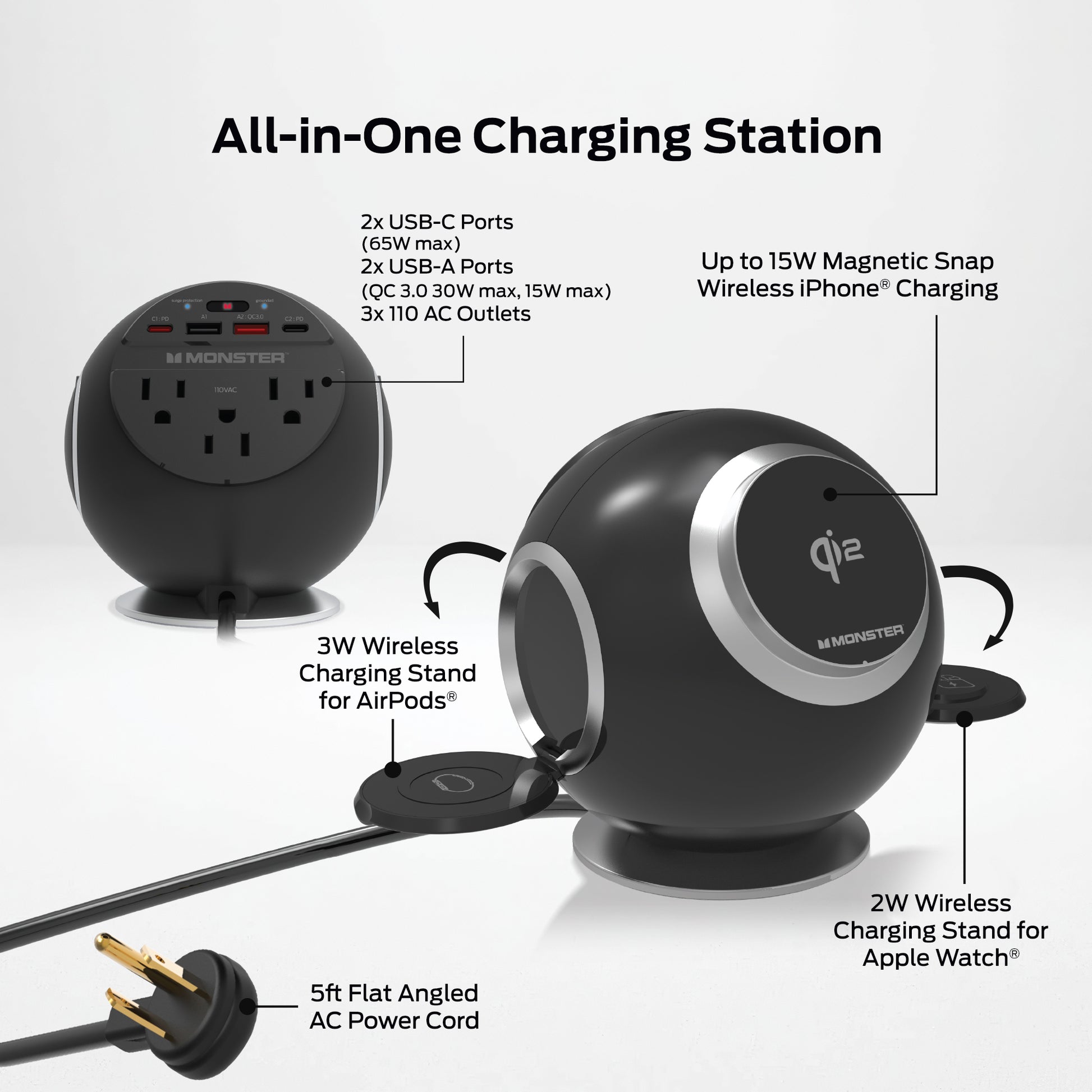 All-in-One Charging Hub: Consolidate your power needs with 3 AC outlets, 2 USB-C ports, 2 USB-A ports, and multi-device wireless charging, all in one compact sphere.