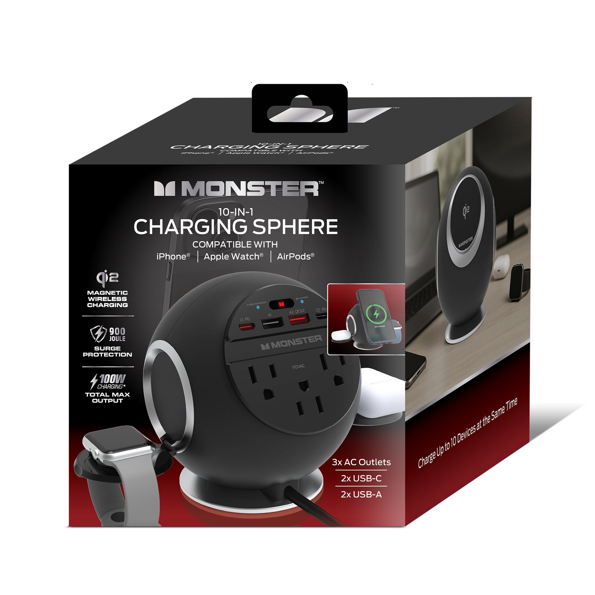 Declutter your desk and power up all your devices with the revolutionary 10-in-1 Desktop Wireless Charging Sphere. This sleek, space-saving hub is designed to be the ultimate power solution for your modern life, offering seamless compatibility with iPhone, Apple Watch, and AirPods. Boasting a robust 900 Joules of surge protection and a massive 100W max output, it safely and rapidly charges everything from laptops to smartphones. With 3 AC outlets, 2 USB-C ports, 2 USB-A ports, and a convenient back wireless magnetic base, you'll have all the power connections you need in one elegant sphere, transforming your workspace into an organized and efficient charging paradise.