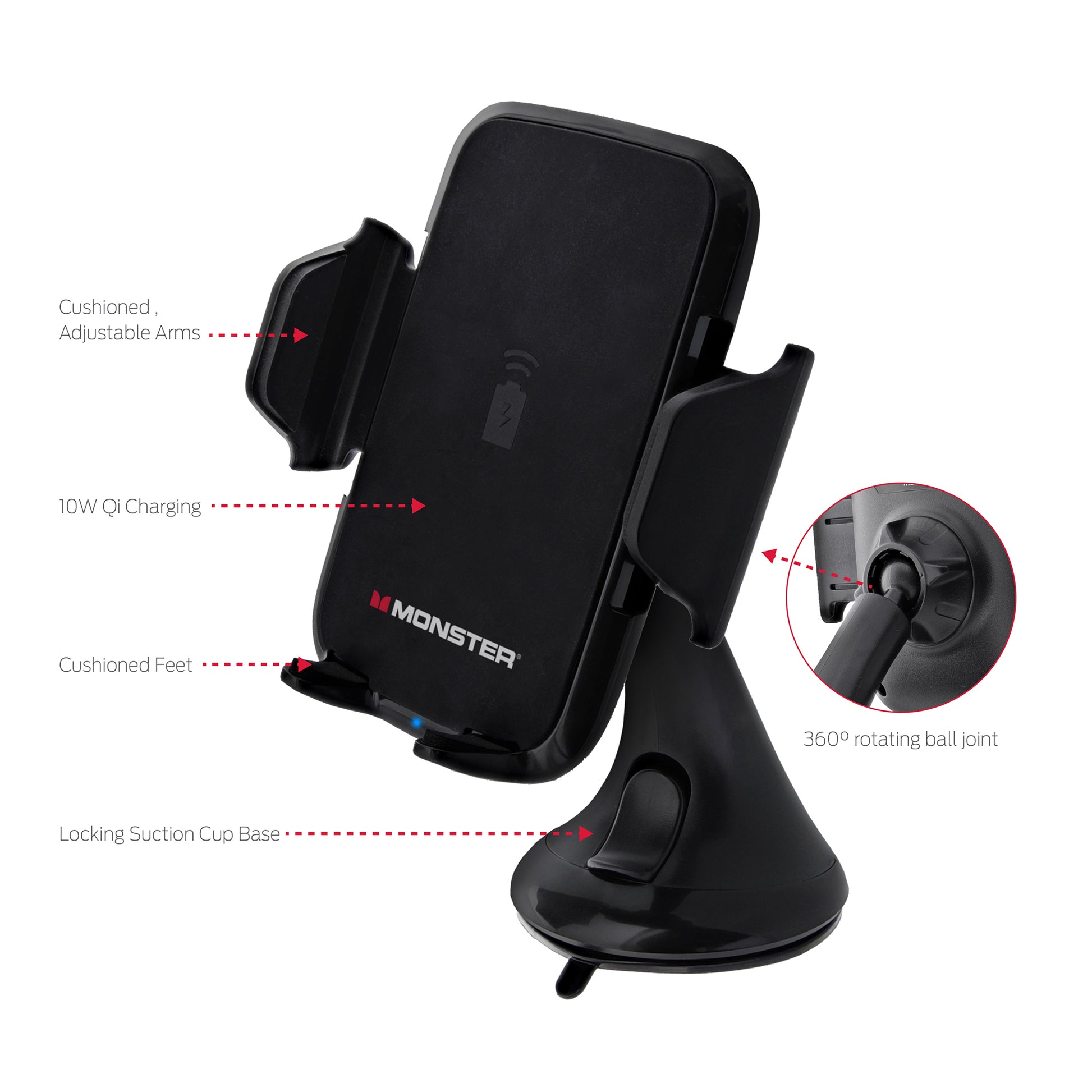 Want to make hands-free calls while you’re driving, and your phone is charging? With the Monster 10W QI Dash Mount, that dream becomes an instant reality. Our Universal Locking Suction Cup securely holds your mobile device while you’re driving on any roadway. The included Air Vent Clip also connects your device to any car air vent without issue. Our 360-degree Rotating Ball Joint allows you to move the mount in any direction for the perfect viewing angle. Our 10-Watt wireless charger quickly powers your devices with no complicated setups or additional add-ons. Perfect for any dashboards, windshields or air vents, the Monster 10W QI Mount will give you the best possible hands-free driving experience.