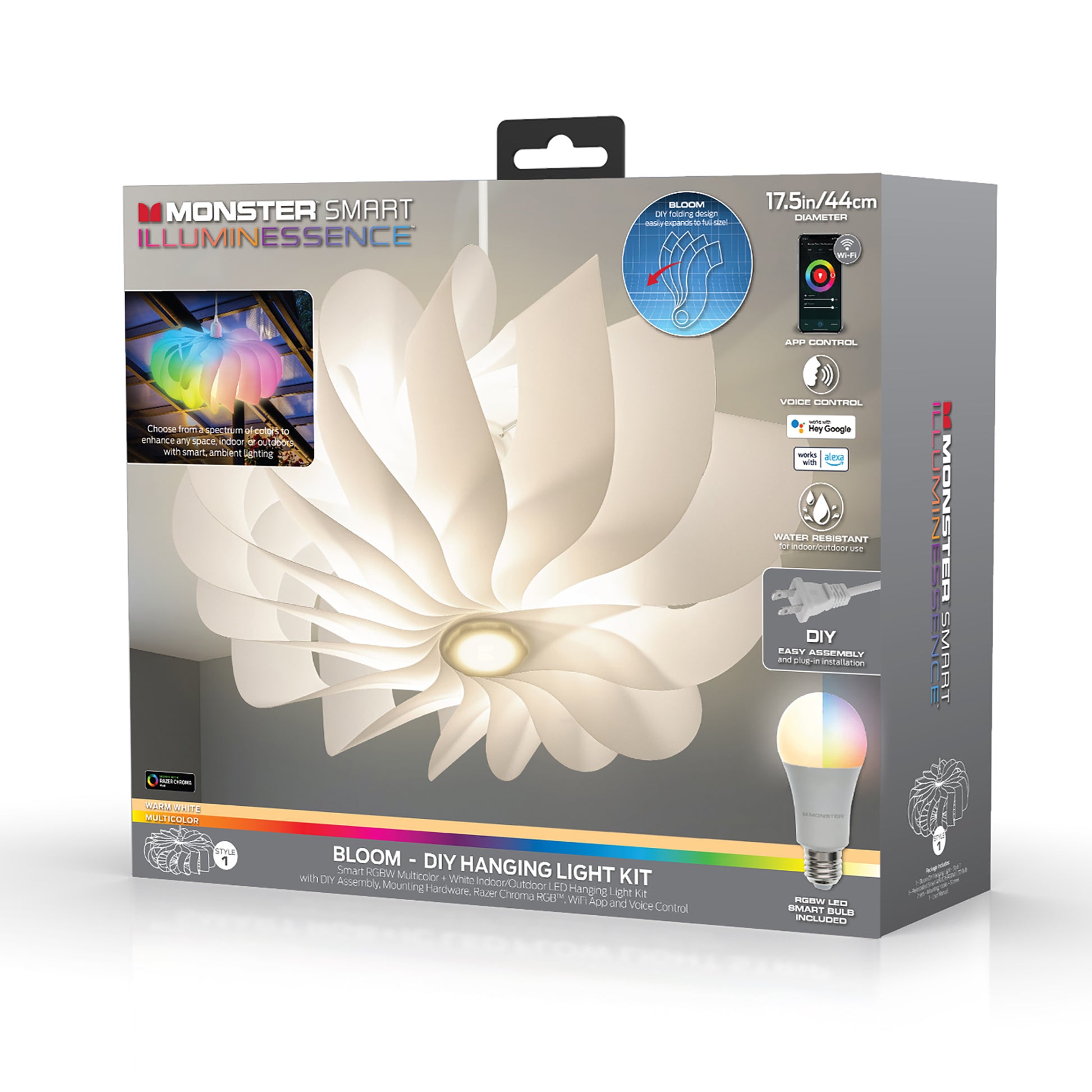 Whether indoors or outdoors, the right lighting can make all the difference. With the Monster Smart Illuminessence Bloom DIY Hanging Light Kit you’ll be able to greatly transform any space. Using the included A19 LED Bulb, you can craft unique lighting with our downloadable app. Whether at home or away, you can make quick, instant changes. Beyond the multicolor effects, you also have a standard Warm White light for everyday activities. Our Razer Chroma RGB technology allows you to sync your lights to compatible PC accessories, games and music to create the most striking results anytime. Link to Alexa, Siri or Google Assistant for full voice control when you prefer. A 15ft extension cord connects it to any nearby outlet and installation’s a breeze with 2 celling hooks and 2 cord hooks included. Illuminate your locale with the Smart Illuminessence Bloom DIY Hanging Light Kit.