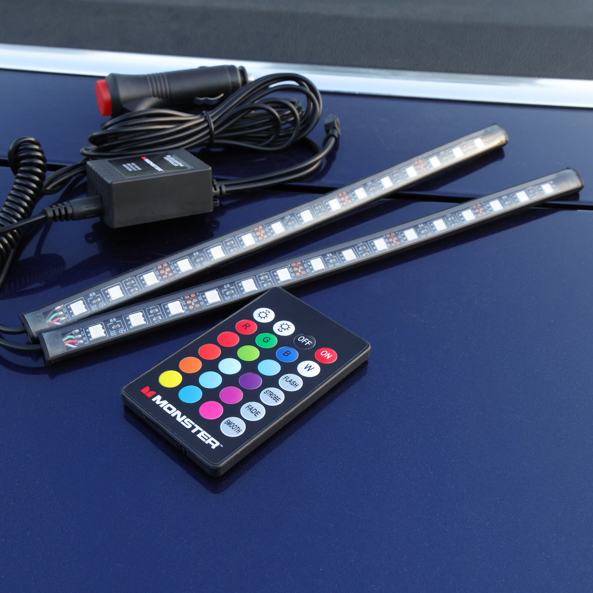 When it comes to your vehicle, brightening up your space can add much to your daily driving. With the Monster Multicolor Car Interior LED Accent Lights 2-Pack, you can transform how it will look forever. The 10.5-inch light strips feature customizable colors and flash modes that can be controlled by your included remote control. You’ll be able to modify them to best reflect your interior or mood in general. Our strip is powered by a 12V Car DC Adapter that easily connects to your DC port and installation’s a breeze, just peel off the backing and use the pre-installed adhesive to attach the light strip to any smooth interior surface. Make your interior look striking with the Monster Multicolor LED Accent Lights 2-Pack.