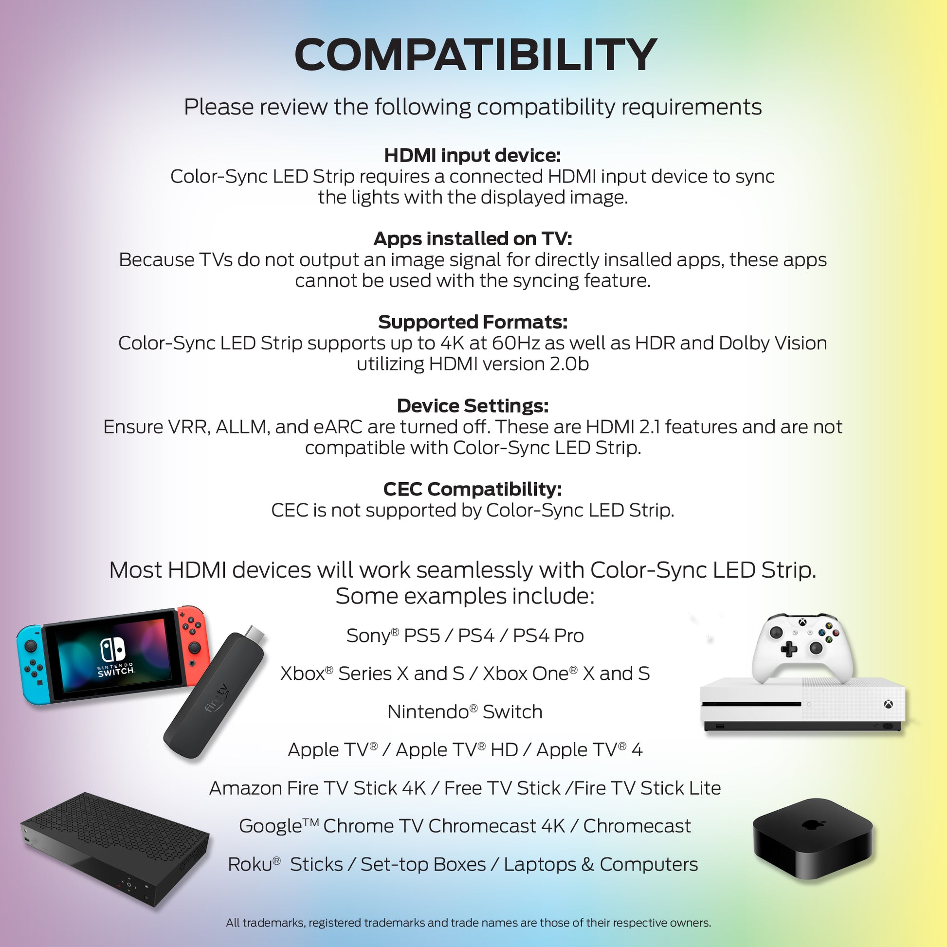 Smart Lighting HDMI Color Sync LED Strip for TVs Up to 85”, Color Flow, Music Mode, App & Voice Control, HDMI Decoder