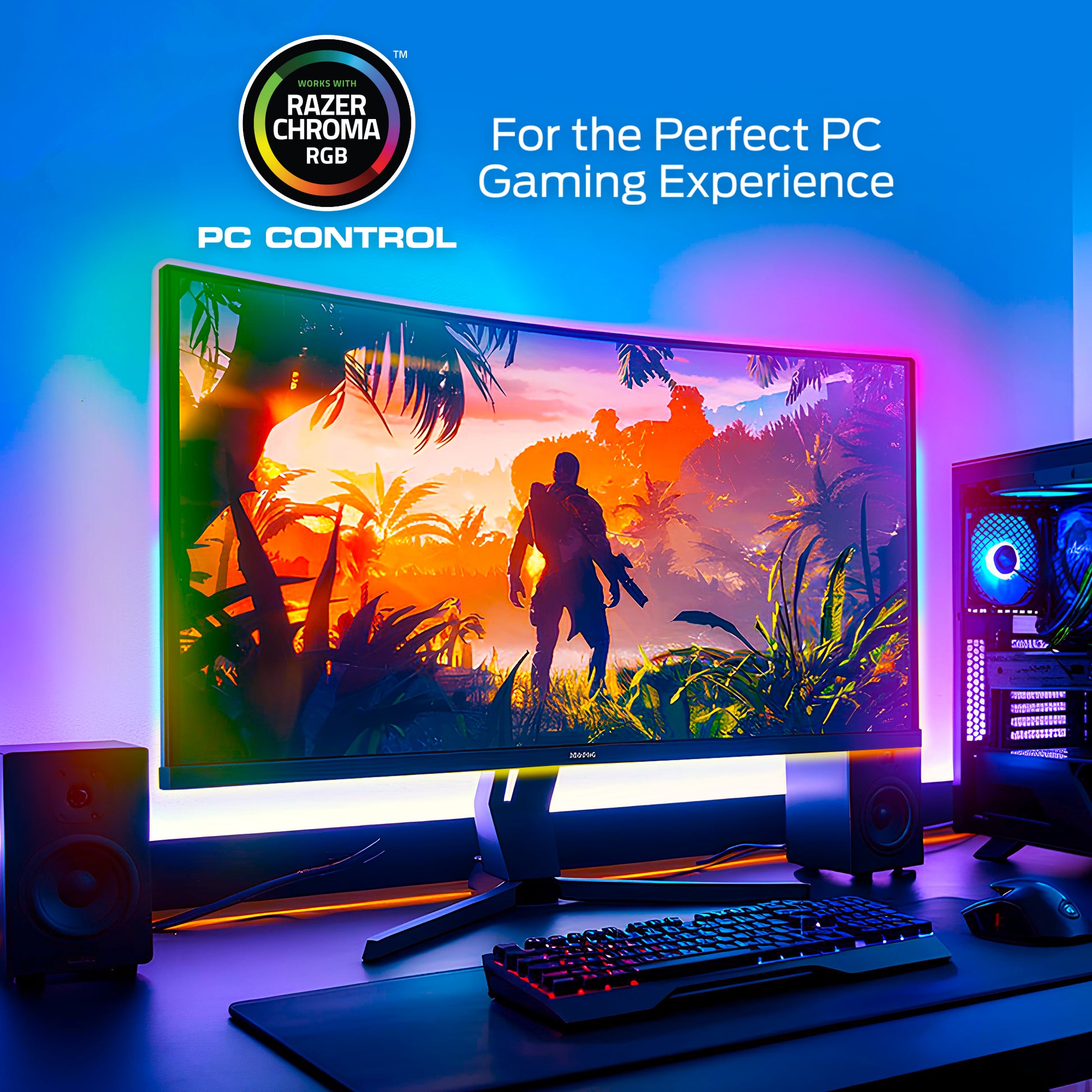 Transform your viewing experience with the Monster Smart Lighting Color Sync LED Strip for TVs up to 85 inches. Using HDMI signal syncing and RGBIC flow technology, this lighting system mirrors the colors on your screen in real time, delivering immersive ambient lighting for movies, games, and music. Compatible with the Monster Smart App and major voice assistants like Alexa, Google Assistant, and Siri, you can customize lighting scenes, activate Music Sync mode, and schedule lighting routines. The HDMI decoder box ensures plug-and-play functionality without additional software. Sync your setup with Razer Chroma RGB™ for vibrant gaming ambiance. Includes mounting clips and power adapter for a complete setup.