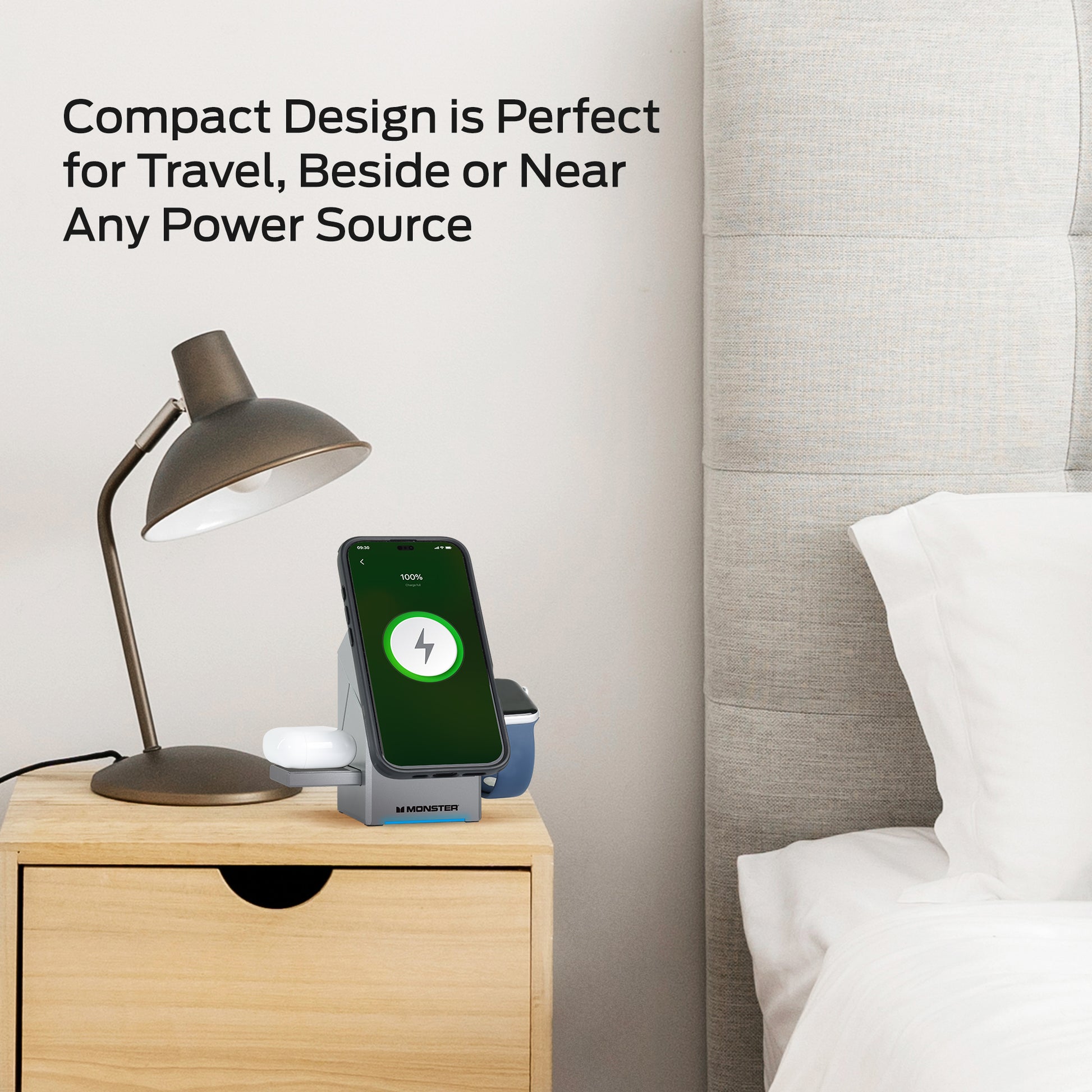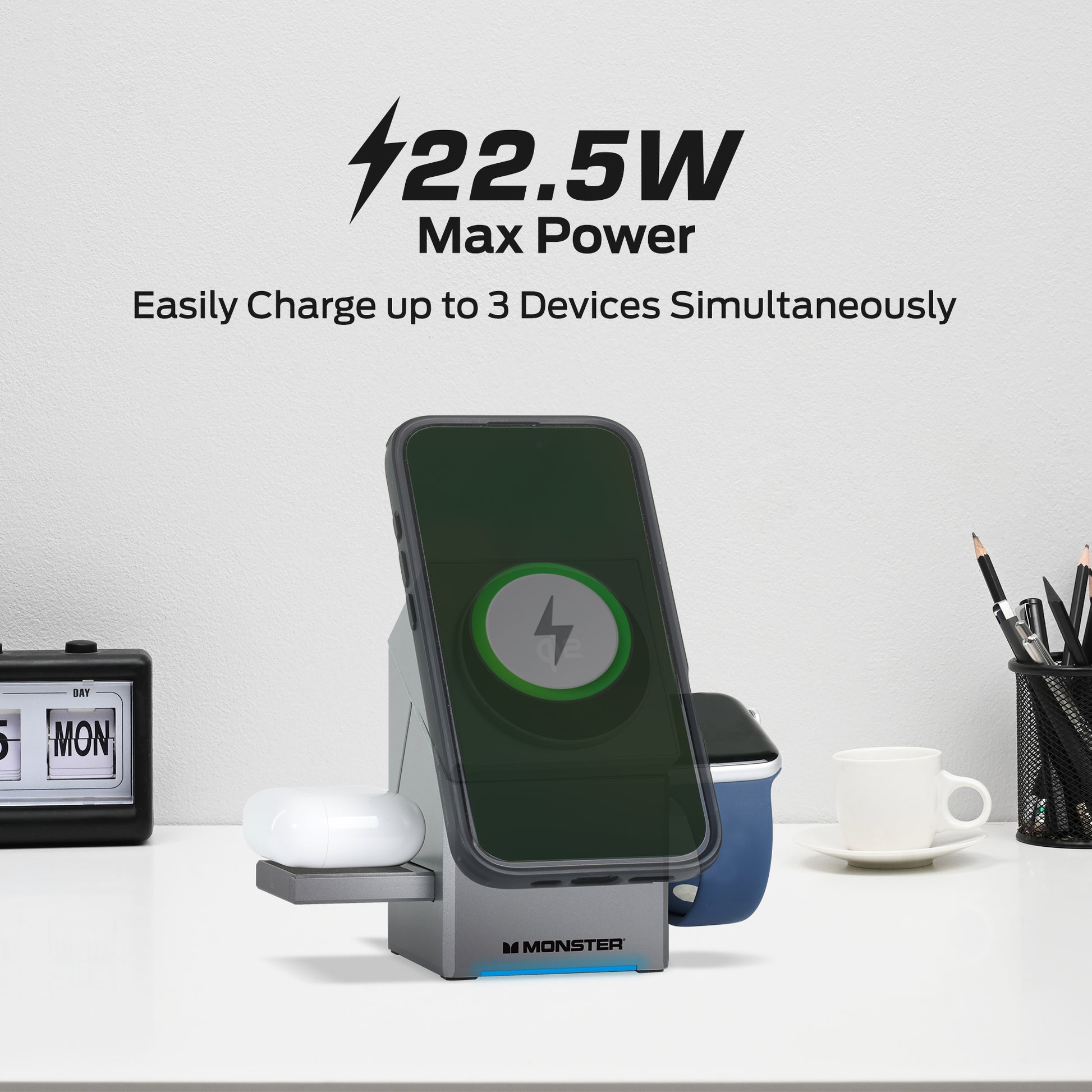 Introducing the Monster 3-in-1 Motorized Charger, the ultimate all-in-one charging solution for your Apple devices. This sleek and compact station wirelessly powers your iPhone, Apple Watch, and AirPods simultaneously with a total output of 22.5W, ensuring all your essential gadgets are ready to go. Its unique touch-activated motorized design smoothly rotates to your desired charging position, while the magnetic connection holds your devices securely in place. Perfect for your nightstand or desk, and a must-have for travel, this charger comes complete with a powerful 30W PD wall adapter and a 6ft USB-C cable, so you have everything you need to charge up quickly and efficiently, anywhere you are.