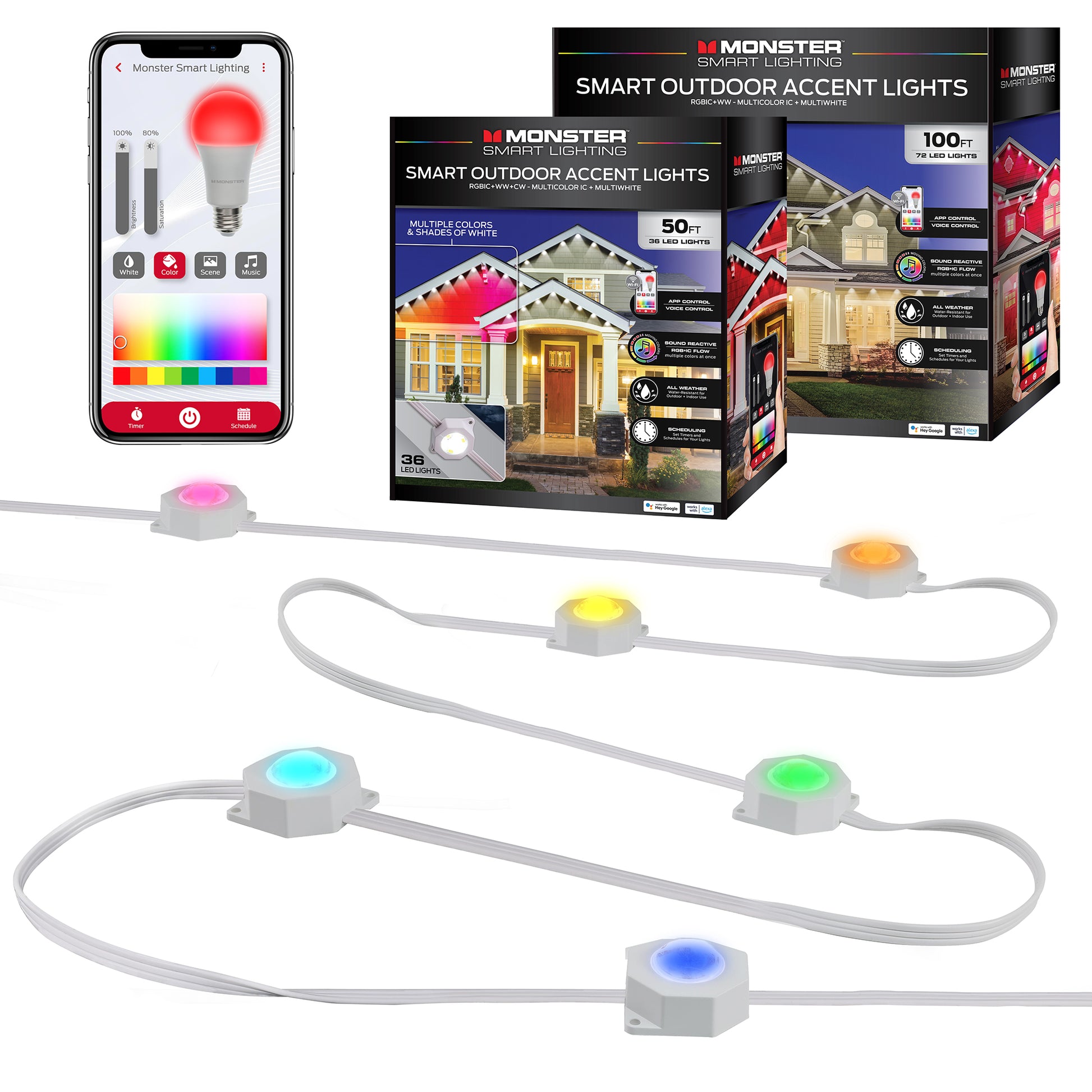Transform your home’s exterior with the Monster Smart Permanent Outdoor Lights, a 50ft smart lighting system designed to enhance any outdoor space with vibrant, customizable lighting. Featuring 36 high-quality LEDs, these lights are perfect for eaves, roofs, patios, or any area of your home’s exterior. The Monster Smart Outdoor Lights feature advanced RGB+IC+Multi-White technology, allowing each LED to display multiple colors at once. This creates dynamic, flowing lighting effects that make your home stand out, whether you’re celebrating the holidays or enjoying a quiet evening outside. With the ability to choose from a wide array of colors and lighting patterns, you can easily customize your lighting setup to match any mood or event. Designed for durability, these outdoor lights are built to withstand year-round exposure to the elements. Both water and weather resistant, they can handle rain, snow, and extreme temperatures, making them perfect for long-term installation. You can leave them up all year without worrying about damage from harsh weather conditions, ensuring they’ll remain vibrant and functional no matter the season. Controlling the Monster Smart Permanent Outdoor Lights is simple and convenient. With the Monster Smart app, you can manage your lights from anywhere, adjusting brightness, colors, patterns, and schedules with just a few taps. For hands-free control, these lights also Compatible with Alexa and Google Assistant, allowing you to change settings or turn them on and off using voice commands. Perfect for holiday displays and everyday use, these lights are ideal for creating memorable lighting experiences. From spooky Halloween effects to festive Christmas cheer, or simply lighting up your backyard for a summer evening gathering, the Monster Smart Permanent Outdoor Lights provide the flexibility and creativity you need to make your outdoor space truly shine.