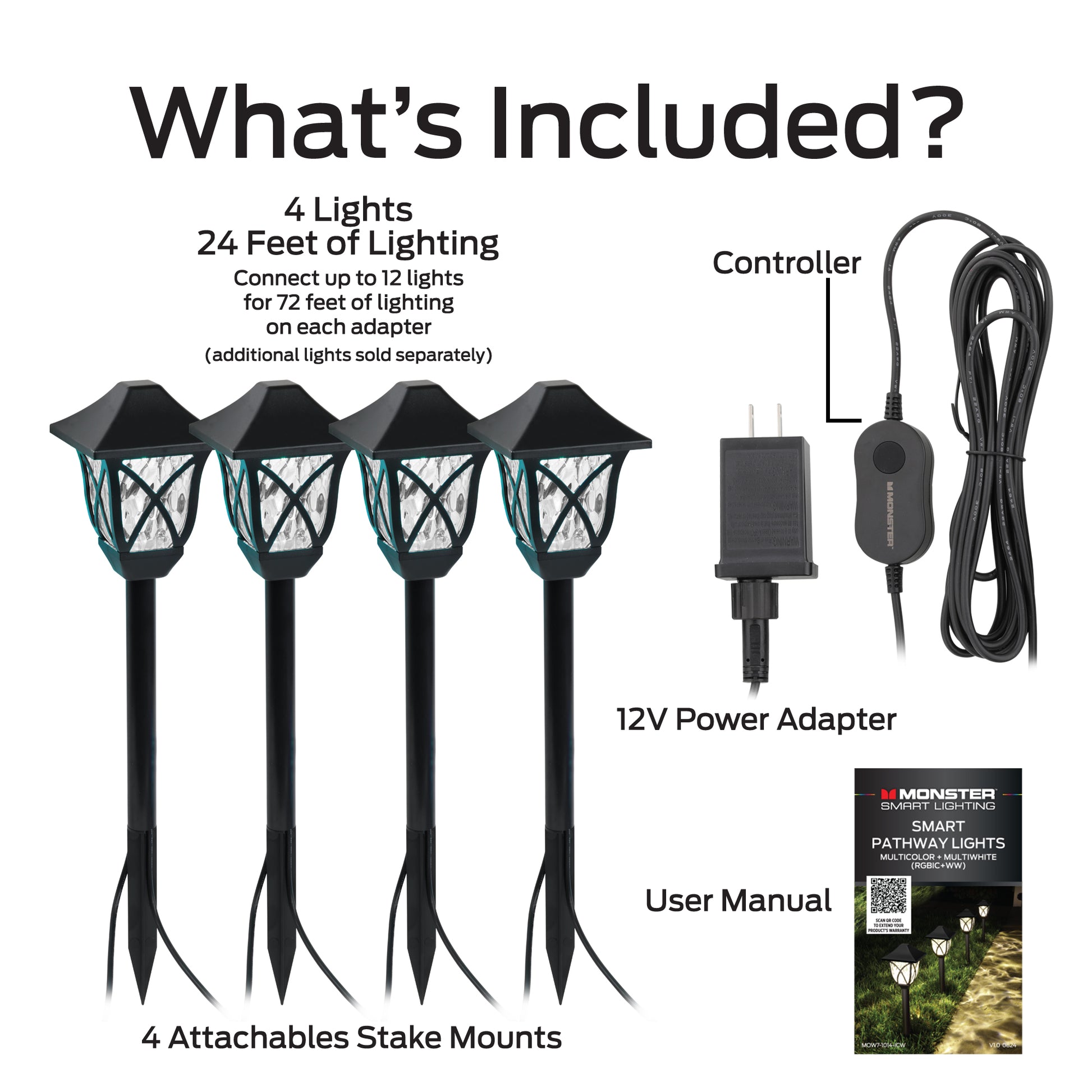Enhance your pathways and outdoor spaces with the Monster Smart RGB+IC+WW Pathway LED Lights, designed to bring vibrant, customizable illumination to any environment. Each set includes four individually controlled, dimmable LEDs with RGB+IC+WW technology, allowing you to set the perfect ambiance with a full spectrum of colors or multiwhite options. Ideal for highlighting walkways, driveways, and garden areas, these lights are spaced up to 6 feet apart for versatile coverage. With IP44-rated water and weather resistance, they’re built to withstand outdoor conditions, ensuring lasting performance year-round. These smart pathway lights are compatible with Alexa, Google Assistant, Siri, and Razer Chroma, enabling seamless voice control and integration with gaming setups. You can also manage all functions through the Monster Smart app, which offers a range of customization options, including scheduling, scene setting, grouping, and sound-reactive modes that sync lights to your music. Connect up to 12 lights on a single adapter for expansive, cohesive lighting coverage that’s perfect for holiday decorating, events, or enhancing everyday curb appeal. Create stunning, dynamic lighting effects that make your outdoor spaces stand out with Monster Smart Pathway LED Lights.