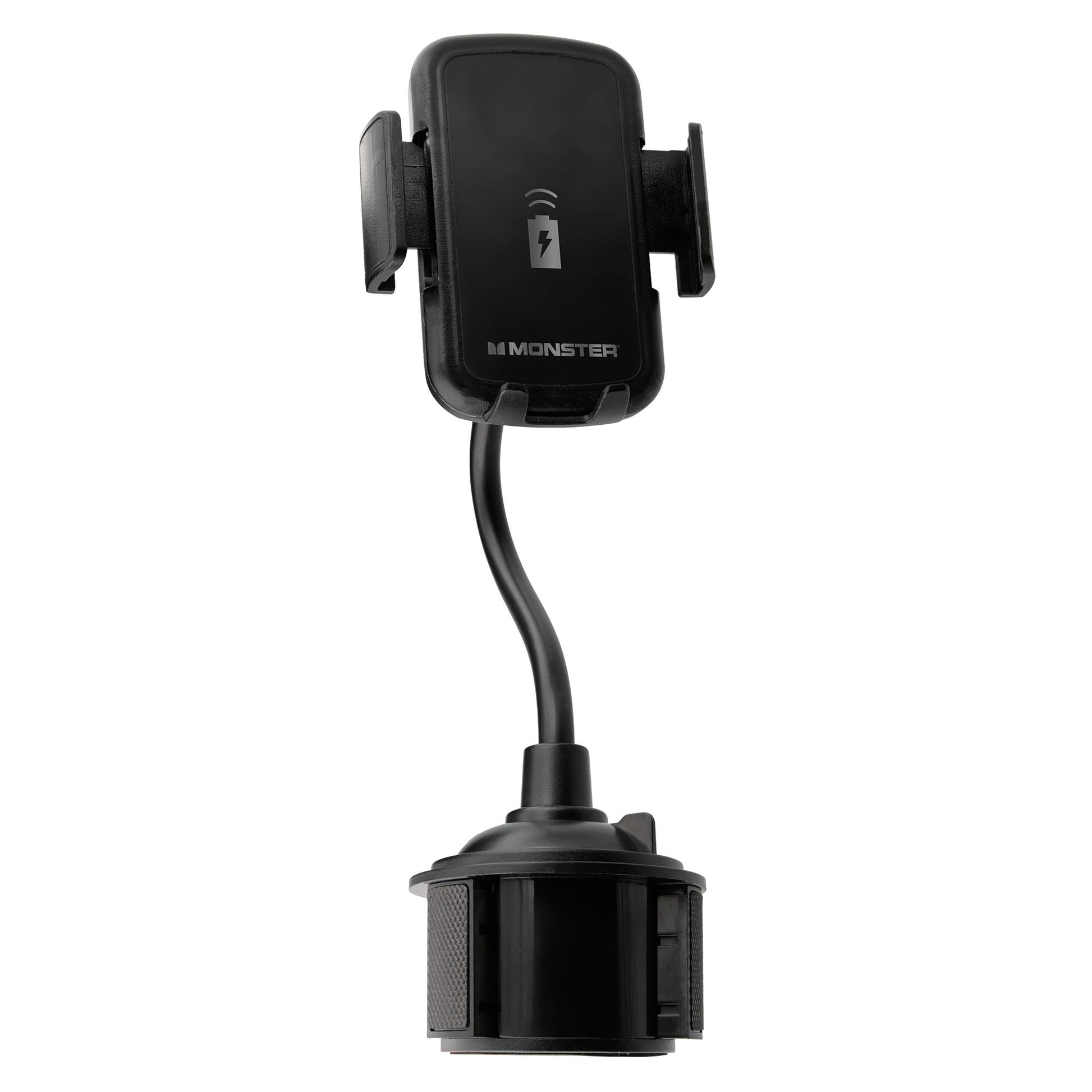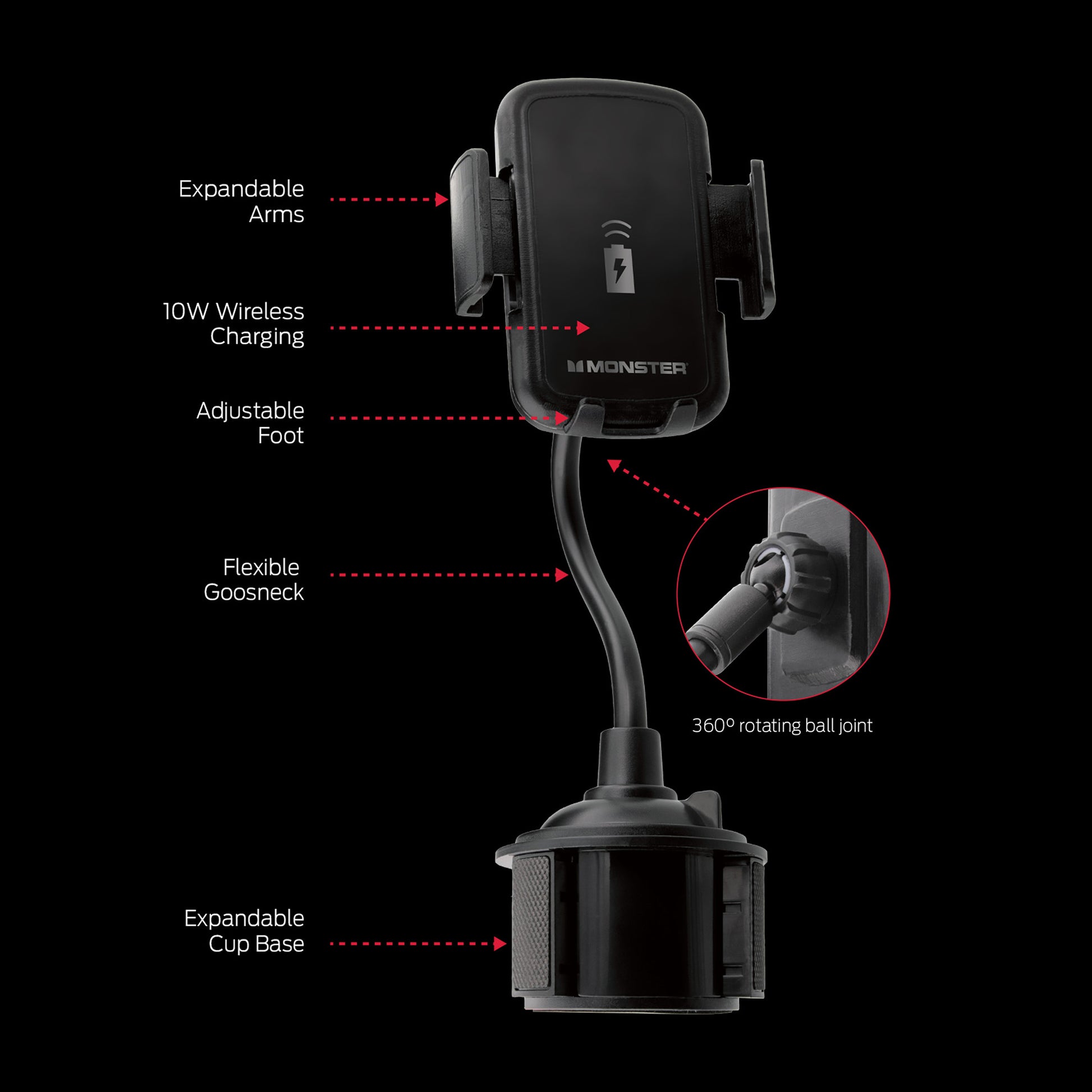 The Monster Wireless Charging Cup Holder Phone Mount provides a safe and convenient place for holding your device while driving. Useable with every available smartphone model, it easily fits into the primary base thanks to the expandable arms and adjustable foot that conforms to its design or case. The base works in most car cupholders for a tight fit that won’t wobble or fall over. Use the gooseneck to turn the phone for the right viewing angle for hands-free calls or accessing GPS directions. Our mount includes a 10-watt wireless charging base that works with all QI-compatible models to repower them. Just connect the included 3ft Micro-USB Cable to the back of the mount and then plug the USB-A side into your car’s DC charger for immediate connectivity. Keep your device secure and powered with the Wireless Charging Cupholder Phone Mount.